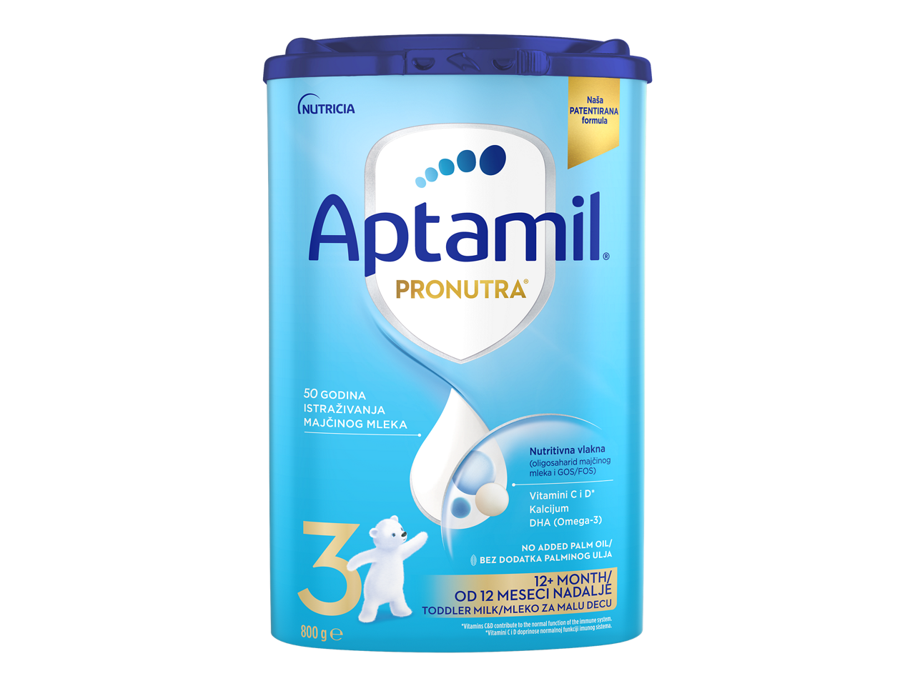 Lactose (from cow's milk), Skimmed cow’s milk, Maltodextrin, Galacto-oligosaccharides (from cow's milk), Whey product (demineralized whey, whey concentrate) (from cow's milk), Vegetable oil (Rapeseed oil, Sunflower oil, High oleic sunflower oil, Coconut oil), Tricalcium phosphate, Fructo-oligosaccharides, Calcium carbonate, Fish oil, Potassium citrate, Magnesium hydrogen phosphate, Sodium citrate, Potassium chloride, L-Ascorbic acid, Emulsifier (Lecithins (soy)), Choline chloride, Flavour (Vanillin), Ferrous sulphate, Inositol, Magnesium chloride, Sodium L-ascorbate, Zinc sulphate, Antioxidant (Ascorbyl palmitate), Calcium D-pantothenate, DL-alpha tocopheryl acetate, Nicotinamide, Riboflavin, Retinyl palmitate, Cholecalciferol, Pyridoxine hydrochloride, Thiamin hydrochloride, Potassium iodide, Pteroylmonoglutamic acid, Phytomenadione, D-Biotin, Cyanocobalamin.